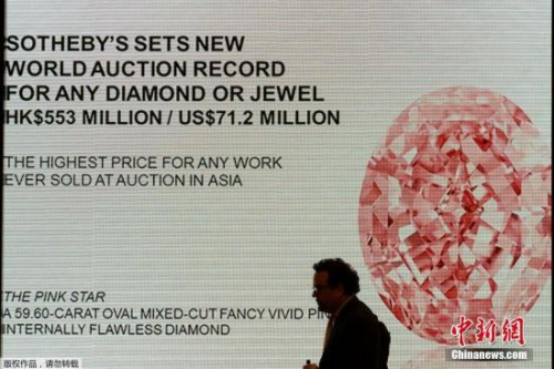 中新網(wǎng)4月5日電 據(jù)外媒報道,近日,重達59.60克拉、一顆被稱為“粉紅之星”的罕見鉆石在香港拍賣的價格超過了7100萬美元,刷新了全球鉆石的拍賣紀(jì)錄。