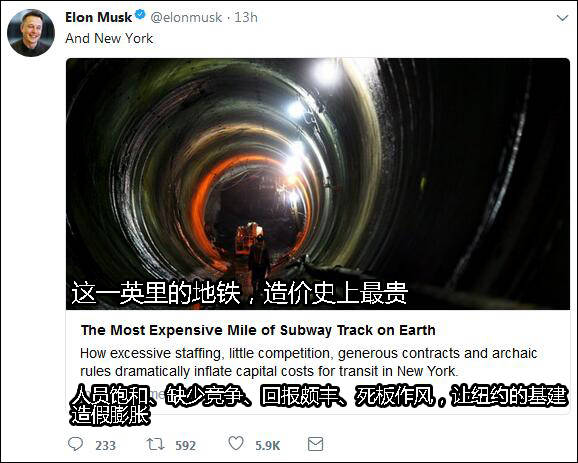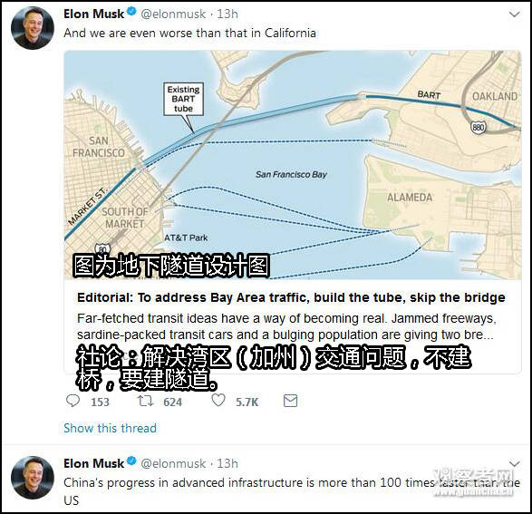 感嘆完中國速度,馬斯克又聯(lián)想到美國加利福尼亞州和紐約市擁堵的交通情況,并“憤怒三連發(fā)”,稱“我們在加州和紐約都做得更差”。