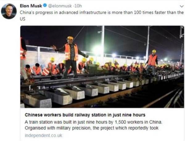 央廣網(wǎng)北京2月28日消息 近年來,中國速度日益引發(fā)外媒關(guān)注。今天(28日),一段中國工人在火車站施工的視頻又走紅美國,剛剛將跑車送上太空的企業(yè)家馬斯克(Elon Musk)也忍不住轉(zhuǎn)發(fā)贊嘆,“中國先進基礎(chǔ)設(shè)施發(fā)展速度比美國快了100多倍”。