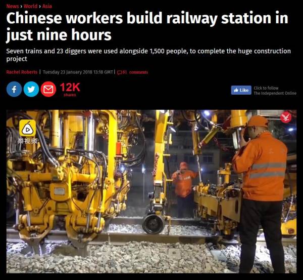 報道以《中國工人建火車站只要9個小時》為標(biāo)題,并稱中國的先進基建工程讓人“嘆為觀止”。