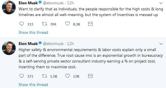 馬斯克還對美國的基建行業(yè)現(xiàn)狀做出了自己的看法。他表示,安全、環(huán)保、人力只是一小部分因素,官僚體系和以利益最大化為目標(biāo)的私企們,才是造成美國基建落后的“罪魁禍?zhǔn)住薄?/p>