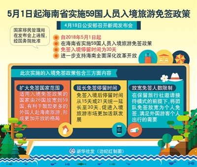 “擴(kuò)大免簽國(guó)范圍;延長(zhǎng)免簽停留時(shí)間;放寬免簽人數(shù)限制?!?月18日,公安部在京召開(kāi)新聞發(fā)布會(huì),國(guó)家移民管理局在發(fā)布會(huì)上通報(bào):經(jīng)國(guó)務(wù)院批準(zhǔn),自2018年5月1日起,在海南省實(shí)施59國(guó)人員入境旅游免簽政策,進(jìn)一步支持海南全面深化改革開(kāi)放。