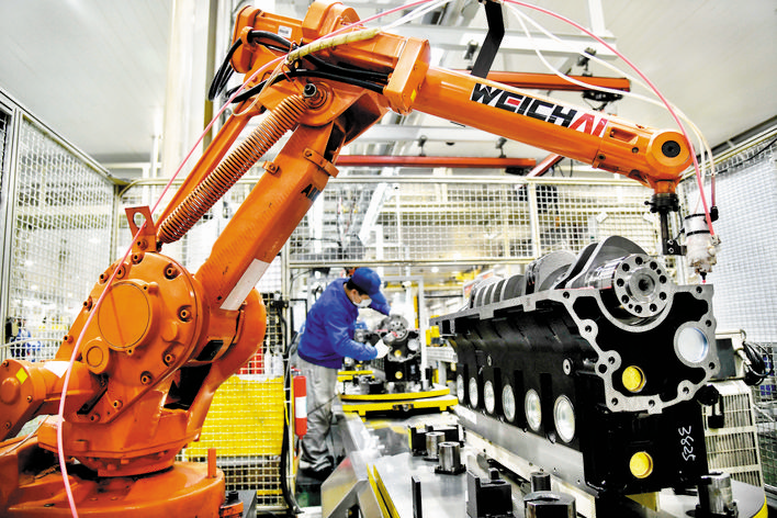 在位于山東濰坊的濰柴集團(tuán)一號工廠總裝車間,工人們在流水線上裝配發(fā)動機(jī)(3月19日攝)。 3月31日,國家統(tǒng)計(jì)局服務(wù)業(yè)調(diào)查中心、中國物流與采購聯(lián)合會發(fā)布數(shù)據(jù),3月份,中國制造業(yè)采購經(jīng)理指數(shù)(PMI)為52%,比上月回升16.3個百分點(diǎn)。