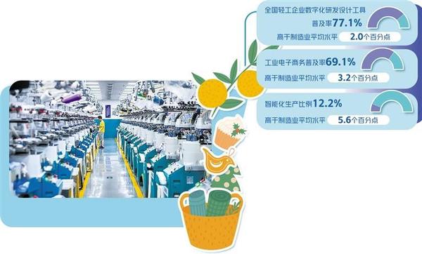 “以輕工業(yè)為例,全國輕工企業(yè)數(shù)字化研發(fā)設計工具普及率77.1%,工業(yè)電子商務普及率69.1%,分別高于制造業(yè)平均水平2.0個和3.2個百分點?!蓖跣⒀笳f。