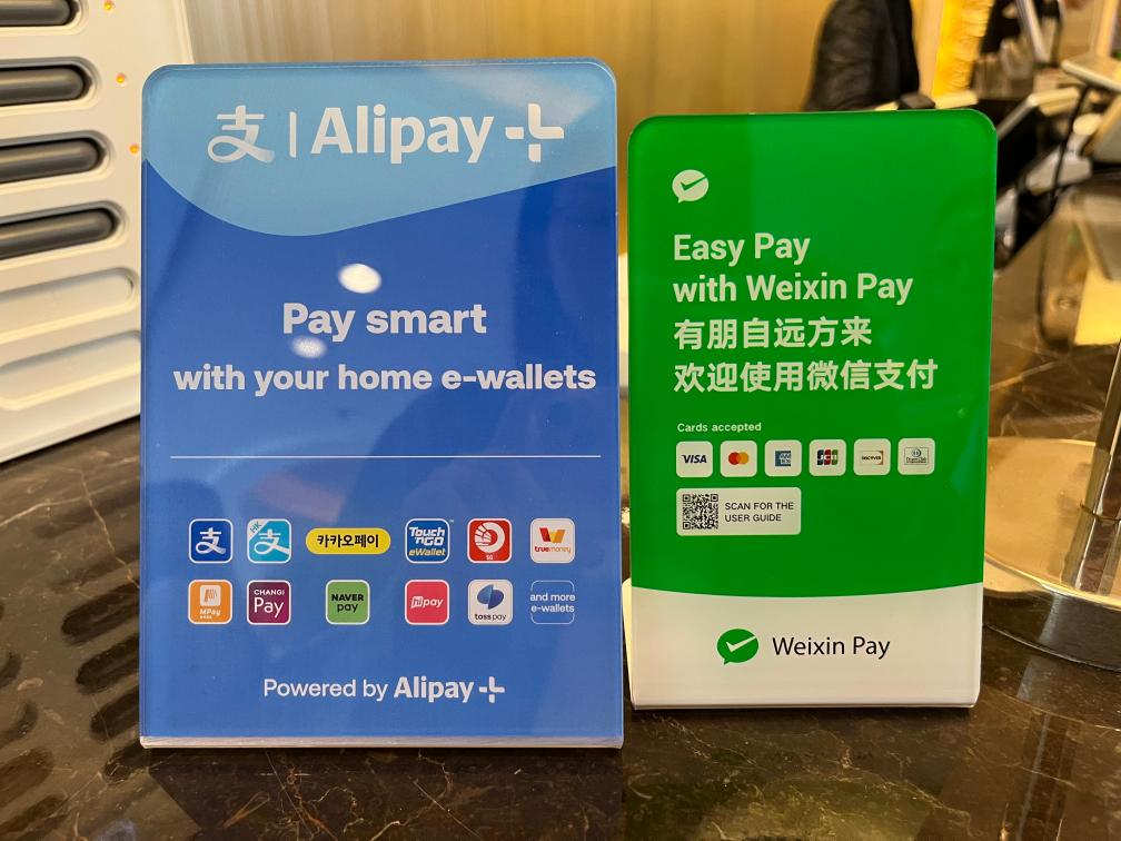 北京香格里拉飯店內(nèi)擺放的支付寶、微信支持使用境外電子錢包和境外銀行卡標(biāo)識(shí)。新華社記者張千千 攝