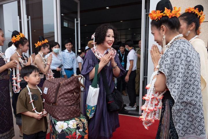 在中老鐵路老撾磨丁站,工作人員歡迎乘坐D887次國際旅客列車的旅客抵達磨丁(2023年4月13日攝)。新華社發(fā)(凱喬 攝)