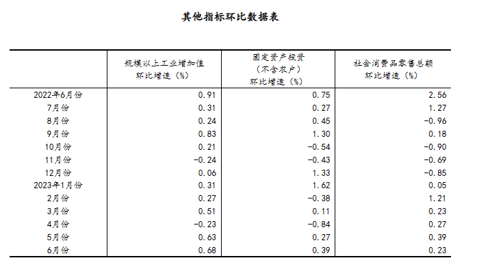 (2)根據(jù)季節(jié)調(diào)整模型自動(dòng)修正結(jié)果,對(duì)近一年來各期國內(nèi)生產(chǎn)總值、規(guī)模以上工業(yè)增加值、固定資產(chǎn)投資(不含農(nóng)戶)、社會(huì)消費(fèi)品零售總額環(huán)比增速進(jìn)行修訂。修訂結(jié)果及2023年二季度GDP環(huán)比數(shù)據(jù)、2023年6月份其他指標(biāo)環(huán)比數(shù)據(jù)如下: