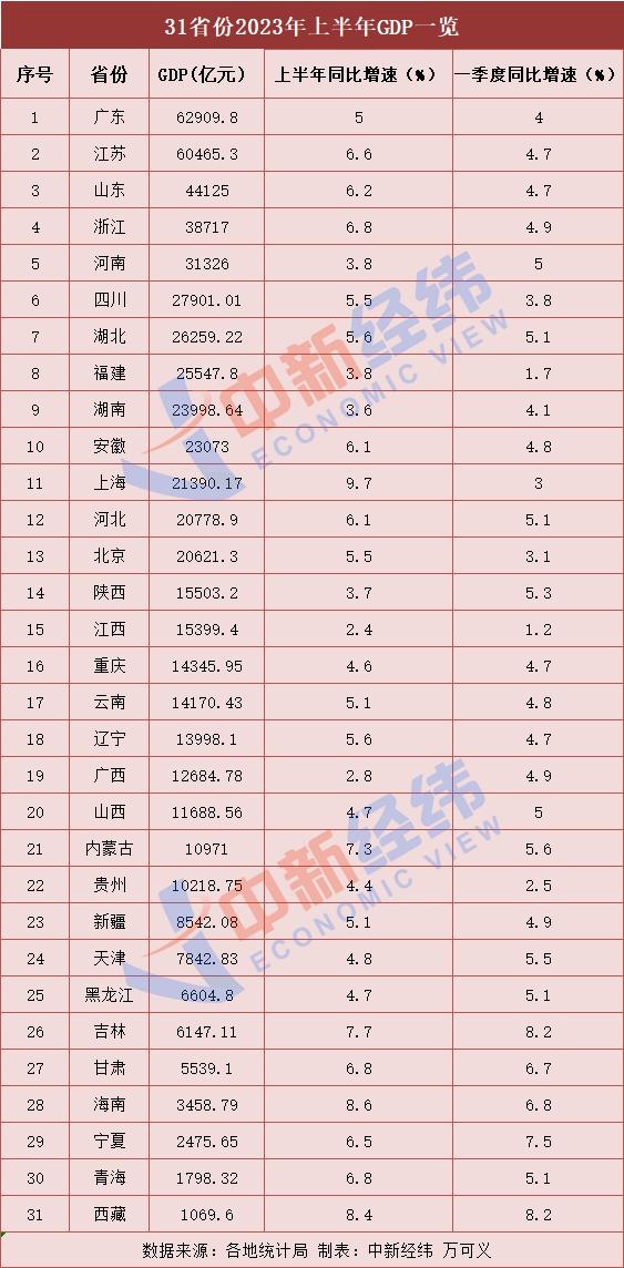 中新經(jīng)緯7月31日電 (萬(wàn)可義)截至7月30日,31省份2023年上半年GDP數(shù)據(jù)已全部出爐??偭糠矫妫浱K魯穩(wěn)居前三;增速方面,15省份高于“全國(guó)線”,上海勢(shì)頭最猛,增速達(dá)到9.7%。