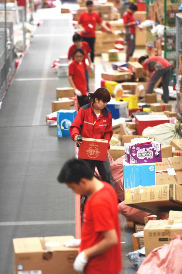 資料圖:6月14日,工作人員在物流中心的分揀中心忙碌,迎接中國(guó)網(wǎng)購(gòu)“狂歡日”。 新華社記者陳曄華攝