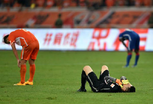 圖說:2016年7月24日,山東魯能隊守門員王大雷(下)在賽后情緒低落。 新華社發(fā)