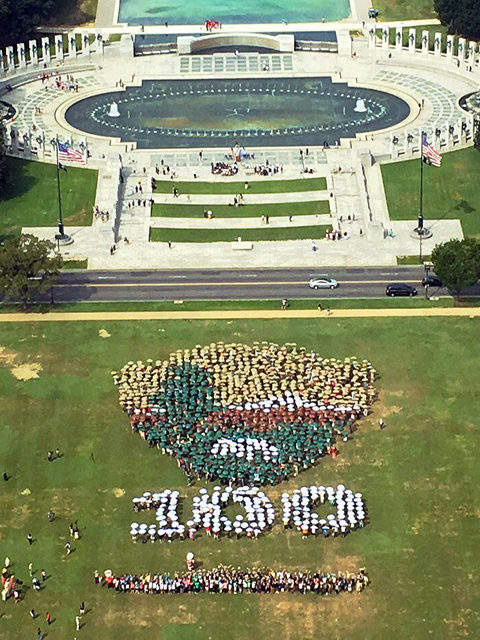 資料圖:8月25日,約千名民眾聚集在華盛頓紀(jì)念碑前的草地上,手舉各色雨傘,組成美國國家公園管理局的徽章圖案,慶祝美國國家公園管理局成立一百周年。新華社發(fā)