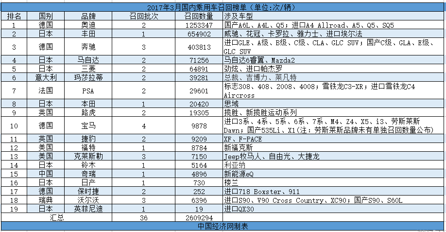 根據(jù)國家質(zhì)檢總局缺陷產(chǎn)品管理中心3月份發(fā)布的召回公告,中國經(jīng)濟網(wǎng)汽車頻道經(jīng)過匯總、統(tǒng)計,整理出“3月國內(nèi)乘用車召回榜單”。3月份,中國汽車市場內(nèi)共有21個汽車品牌發(fā)布了累計36次召回公告,共計召回2609294輛汽車。