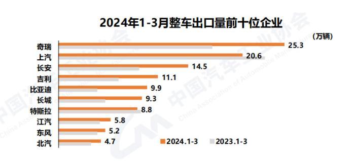 2024年一季度汽車出口數(shù)據(jù)。數(shù)據(jù)來源:中國汽車工業(yè)協(xié)會