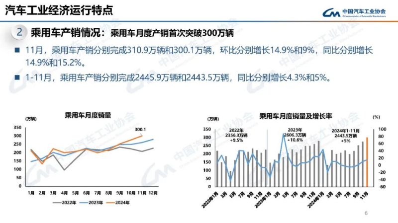 乘用車(chē)月度產(chǎn)銷(xiāo)首次突破300萬(wàn)輛。11月,乘用車(chē)產(chǎn)銷(xiāo)分別完成310.9萬(wàn)輛和300.1萬(wàn)輛,環(huán)比分別增長(zhǎng)14.9%和9%,同比分別增長(zhǎng)14.9%和15.2%。1—11月,乘用車(chē)產(chǎn)銷(xiāo)分別完成2445.9萬(wàn)輛和2443.5萬(wàn)輛,同比分別增長(zhǎng)4.3%和5%。