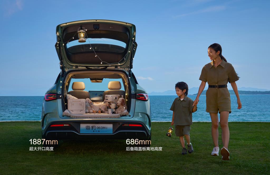 海豹06DM-i旅行版車身尺寸為4,850mm*1,890mm*1,505mm,軸距為2,790mm,后排座椅放倒后容積達(dá)到1535L,全系標(biāo)配電動(dòng)后尾門,后備箱開口高度達(dá)1887mm,后備箱蓋版離地高度僅686mm,可取放大件物品。新車后備箱還配備同級(jí)最多9個(gè)實(shí)用掛鉤,配合全系標(biāo)配的車載行李架,空間功能性和拓展性進(jìn)一步提升,實(shí)現(xiàn)場(chǎng)景自由。