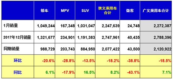 具體車型方面,1月SUV和轎車的銷量環(huán)比均出現(xiàn)下滑,同比則大幅增長(zhǎng),這也是1月份乘用車市場(chǎng)實(shí)現(xiàn)開(kāi)門紅的主要?jiǎng)恿?;而MPV仍沒(méi)有復(fù)蘇的跡象,銷量同環(huán)比均出現(xiàn)下滑。