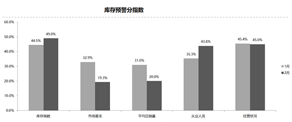 從庫存預警分指數(shù)來看,庫存指數(shù)、從業(yè)人員指數(shù)環(huán)比上升;市場銷量指數(shù)、平均日銷量指數(shù)、經(jīng)營狀況指數(shù)環(huán)比下降。樊宇表示,2月庫存預警指數(shù)較高,依然位于50%的警戒線之上。同時,因為市場需求和平均日銷量呈明顯下降狀態(tài),經(jīng)銷商面臨較大壓力。