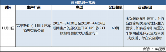 中國網汽車11月4日訊 近日,克萊斯勒(中國)汽車銷售有限公司根據《缺陷汽車產品召回管理條例》和《缺陷汽車產品召回管理條例實施辦法》的要求,向國家市場監(jiān)督管理總局備案了召回計劃。決定自11月1日起,召回2017年9月30日至2018年4月26日期間生產的部分進口2018年款3.6L旗艦尊耀版大切諾基汽車,共計60輛。