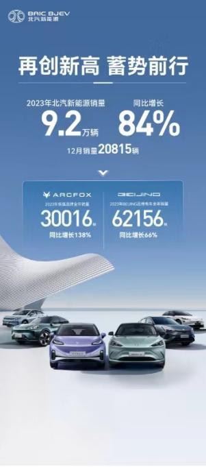 2023年,北汽藍谷銷量大幅攀升,旗下子公司北汽新能源1—12月累計銷售新車92172輛,同比增長84%。其中,12月,北汽新能源單月銷量20815輛。