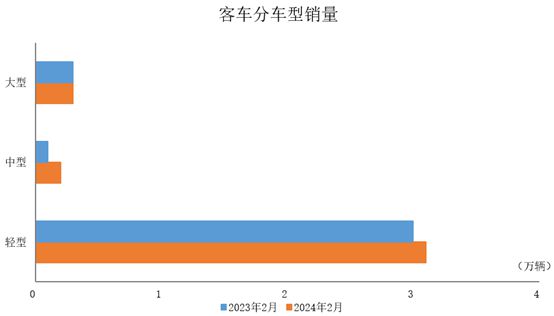2024年2月,客車產(chǎn)銷分別完成3萬(wàn)輛和3.6萬(wàn)輛,產(chǎn)量環(huán)比下降15.7%,銷量環(huán)比增長(zhǎng)1.6%;產(chǎn)量同比下降13%,銷量同比增長(zhǎng)6.9%。與上月相比,輕型客車產(chǎn)量呈兩位數(shù)下降、銷量小幅增長(zhǎng),其他兩大類客車品種產(chǎn)銷均呈兩位數(shù)下降;與上年同期相比,大型客車和中型客車產(chǎn)銷均呈明顯增長(zhǎng),輕型客車產(chǎn)量呈兩位數(shù)下降、銷量小幅增長(zhǎng)。