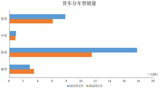 2024年2月,貨車產(chǎn)銷分別完成20.3萬(wàn)輛和21.5萬(wàn)輛,環(huán)比分別下降30.4%和25.5%;同比分別下降28.2%和25.9%。與上月相比,微型貨車產(chǎn)量呈兩位數(shù)下降、銷量明顯增長(zhǎng),其他三大類貨車品種產(chǎn)銷均呈兩位數(shù)下降;與上年同期相比,中型貨車產(chǎn)量呈兩位數(shù)增長(zhǎng)、銷量呈兩位數(shù)下降,微型貨車產(chǎn)量呈兩位數(shù)下降、銷量呈兩位數(shù)增長(zhǎng),重型貨車和輕型貨車產(chǎn)銷均呈明顯下降。