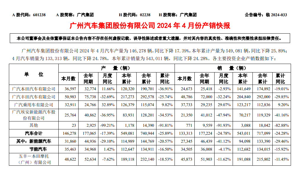 受廣汽豐田持續(xù)下滑影響,廣汽集團(tuán)市場表現(xiàn)同樣糟糕。根據(jù)廣汽集團(tuán)公布產(chǎn)銷量快報(bào)顯示,廣汽集團(tuán)前4個(gè)月累計(jì)銷量為 543,011輛,同比下降 24.28%。
