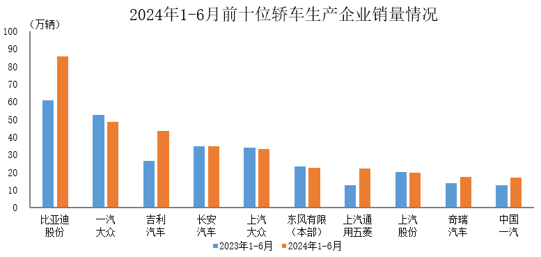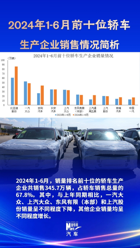 據(jù)中國(guó)汽車工業(yè)協(xié)會(huì)統(tǒng)計(jì)分析,2024年1-6月,銷量排名前十位的轎車生產(chǎn)企業(yè)共銷售345.7萬(wàn)輛,占轎車銷售總量的67.8%。
