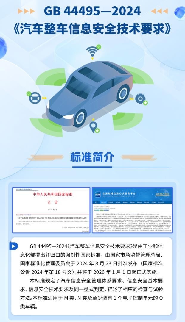 GB 44495—2024《汽車整車信息安全技術(shù)要求》規(guī)定了汽車信息安全管理體系要求,以及外部連接安全、通信安全、軟件升級安全、數(shù)據(jù)安全等方面的技術(shù)要求和試驗方法,適用于M類、N類及至少裝有1個電子控制單元的O類車輛,對于提升我國汽車產(chǎn)品的信息安全防護技術(shù)水平、強化產(chǎn)業(yè)鏈風(fēng)險防范和應(yīng)對網(wǎng)絡(luò)攻擊的能力、筑牢汽車信息安全防護基線具有重要意義。