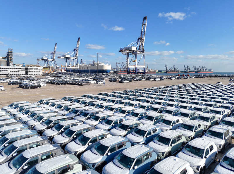12月8日,大批商品車在山東港口煙臺(tái)港等待裝船(無人機(jī)照片)。新華社發(fā)(張進(jìn)剛攝)