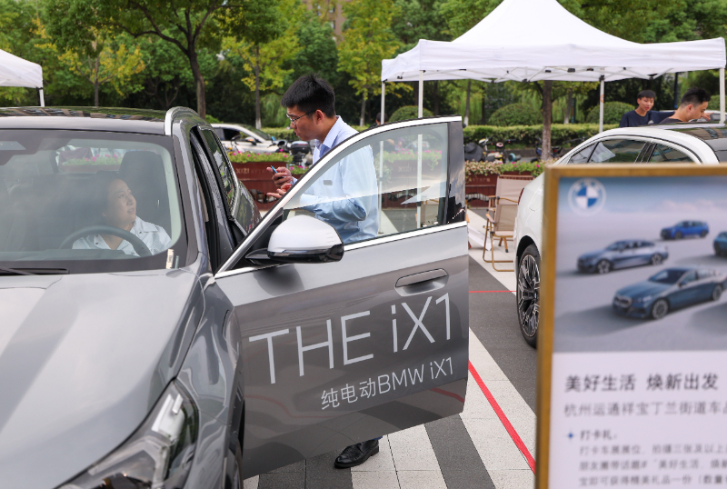 (資料照片)經(jīng)銷商在消費品以舊換新展會現(xiàn)場向消費者介紹車輛。新華社記者 江漢 攝