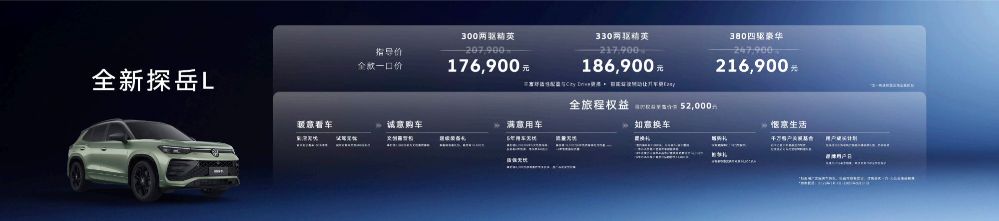 3月1日,一汽-大眾全新探岳L在五岳之首泰山震撼上市,新車共推出300TSI、330TSI、380TSI三種動(dòng)力配置共3種車型,官方指導(dǎo)價(jià)20.79萬(wàn)元起,可選裝舒適性配置豐富的City包和駕駛輔助功能Easy包?,F(xiàn)在購(gòu)買(mǎi)全新探岳L,還將享受17.69萬(wàn)元起的全款一口價(jià)。