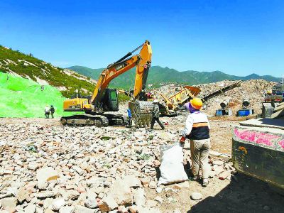 燕山鳳凰亭2號涵洞黑渣土場上,工人正在對建筑垃圾與生活垃圾進(jìn)行二次分揀。