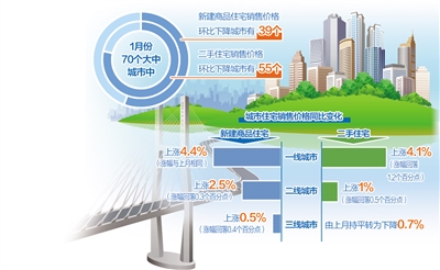 1月份,70個大中城市中,新建商品住宅和二手住宅銷售價格同比下降城市分別有20個和30個,比上月分別增加3個和4個。