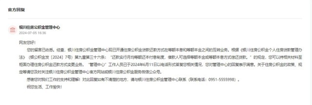 收到留言后,銀川住房公積金管理中心作出公開回復?;貜头Q:經查,銀川住房公積金管理中心現(xiàn)已開通住房公積金貸款還款方式在等額本息和等額本金之間的互轉業(yè)務。網友可以持相關材料至柜面辦理住房公積金還款方式變更業(yè)務。