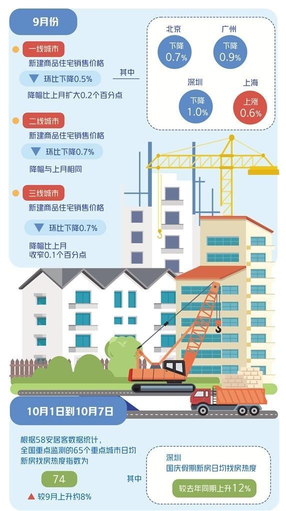 9月26日,中央政治局會議定調(diào)“要促進房地產(chǎn)市場止跌回穩(wěn)”,釋放出“穩(wěn)地產(chǎn)”信號。隨后,一線城市集中優(yōu)化樓市政策,廣州全面取消限購,北京、上海、深圳優(yōu)化限購、限貸政策,北京、上海明確將及時取消普宅認定標準,深圳取消限售,上海、深圳增值稅免征年限“5改2”,帶動國慶假期樓市熱度顯著提升。