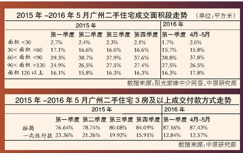 中原研究部監(jiān)測的陽光家緣數(shù)據(jù)顯示,120平方米的物業(yè)在2016年4月~5月份成交占比較第一季度提升了1.5個百分點(diǎn),對于打算生二孩的老百姓來說,一方面,人口增多,需要提前購置大房;另一方面,在低利率的時代,買房不僅可以使資產(chǎn)保值增值,對抗通脹,也能利用低利率政策減少購房成本支出。在2016年成交的3房及以上的物業(yè)付款方式來看,按揭貸款的占比呈一路走高的態(tài)勢,2016年1月~5月份占比在87%的水平,較2015年第三季度多了7個百分點(diǎn)左右。