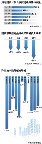 北京在9月30日出臺的政策影響了市場熱度,市場進入了急速冷凍階段。中原地產研究中心統(tǒng)計數(shù)據(jù)顯示,2016年國慶長假期間,7天北京新建住宅簽約216套,二手房住宅簽約209套。合計簽約425套。而2015年國慶7天簽約為543套。從簽約數(shù)據(jù)看,北京新建住宅成交量為2011年來6年最低點。對此,中原地產首席分析師張大偉分析認為,預計北京房價將快速降溫,四季度漲幅將明顯放緩,在自住房大量供應后,部分區(qū)域的價格很可能出現(xiàn)調整。