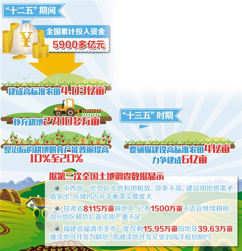 同時(shí),對(duì)耕地的建設(shè)性保護(hù)也迫在眉睫?!敖ㄔO(shè)性保護(hù)指通過(guò)工程措施改善耕地質(zhì)量。”中央農(nóng)辦副主任韓俊介紹,近年來(lái),國(guó)家大力推進(jìn)土地整治與高標(biāo)準(zhǔn)農(nóng)田建設(shè),有效彌補(bǔ)了耕地產(chǎn)能損失。僅高標(biāo)準(zhǔn)農(nóng)田建設(shè)一項(xiàng),“十二五”期間,全國(guó)累計(jì)投入資金5900多億元,建成高標(biāo)準(zhǔn)農(nóng)田4.03億畝,補(bǔ)充耕地2700多萬(wàn)畝,整治后的耕地糧食產(chǎn)能普遍提高10%至20%?!笆濉睍r(shí)期,要確保建設(shè)高標(biāo)準(zhǔn)農(nóng)田4億畝,力爭(zhēng)建成6億畝。