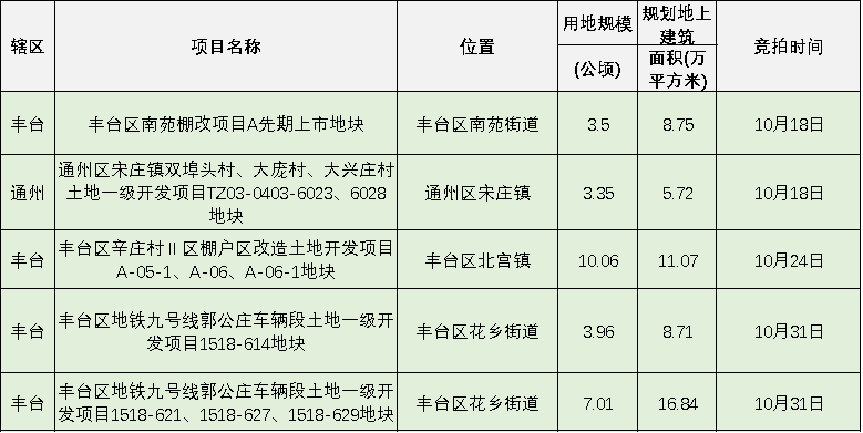根據(jù)北京市規(guī)自委網(wǎng)站顯示,10月份北京還將有5宗宅地入市,其中豐臺4宗、通州1宗。(門庭婷)