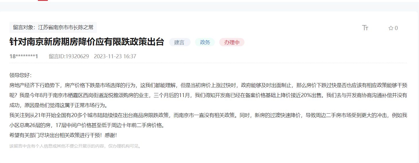 在領(lǐng)導(dǎo)留言板上,11月23日,有網(wǎng)友表示“針對(duì)南京新房期房降價(jià)應(yīng)有限跌政策出臺(tái)”。該網(wǎng)友留言道,“房地產(chǎn)經(jīng)濟(jì)下行趨勢(shì)下,房產(chǎn)價(jià)格下跌是市場(chǎng)選擇的行為,這我們都能理解,但是當(dāng)初房?jī)r(jià)上漲過快時(shí),政府能夠及時(shí)出面制止,那么房?jī)r(jià)下跌過快是否也應(yīng)該有相應(yīng)政策能夠干預(yù)呢?我是今年8月于南京市棲霞區(qū)西崗街道瀧悅雅頌購(gòu)房的業(yè)主,3個(gè)月后的11月,我們得知開發(fā)商已經(jīng)在備案價(jià)格基礎(chǔ)上降價(jià)接近20%出售。我們?nèi)ヅc開發(fā)商協(xié)商溝通補(bǔ)償并沒有成功,原因是他們覺得這屬于正常市場(chǎng)行為。 我關(guān)注到從21年開始全國(guó)有20多個(gè)城市陸陸續(xù)續(xù)在出臺(tái)商品房限跌政策,而南京市一直沒有相關(guān)政策。同時(shí),新房的過度快速降價(jià),導(dǎo)致周邊二手房市場(chǎng)受到更大的沖擊,例如我小區(qū)總高26層的房,17層中間戶價(jià)格甚至低于周邊十年前二手房?jī)r(jià)格?!?/p>