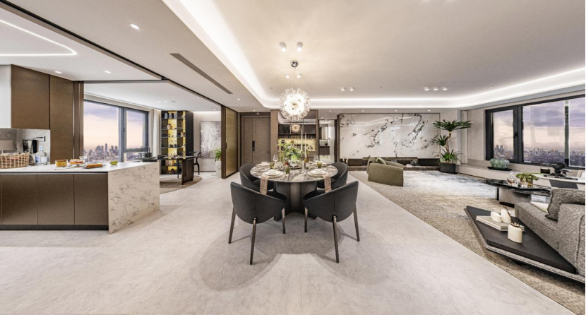 北熙區(qū)170平方米的四室兩廳兩衛(wèi)戶型則采用了現(xiàn)代簡約的設(shè)計風(fēng)格,摒棄繁復(fù)裝飾,使用精選皮革、藝術(shù)玻璃、古銅不銹鋼等現(xiàn)代材質(zhì)匹配大尺度橫向空間,塑造質(zhì)感美學(xué)空間。整體格局規(guī)整,南向面寬達(dá)13.85米,且設(shè)計了通透、多變的客廳空間,既能與廚房聯(lián)通,也可與書房互動,可以是朋友們的歡聚場,也可以是靜享品茗、閱讀美好時光的生活場。主臥套房酒店式設(shè)計,獨(dú)立衣帽間、獨(dú)立衛(wèi)浴,彰顯居者的居住尺度。