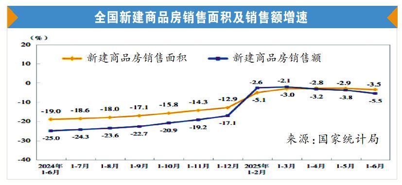 根據(jù)國(guó)家統(tǒng)計(jì)局發(fā)布的2025年上半年全國(guó)房地產(chǎn)市場(chǎng)基本情況,上半年,新建商品房銷售面積45851萬(wàn)平方米,同比下降3.5%;其中住宅銷售面積下降3.7%。新建商品房銷售額44241億元,下降5.5%;其中住宅銷售額下降5.2%。6月末,商品房待售面積76948萬(wàn)平方米,比5月末減少479萬(wàn)平方米。其中,住宅待售面積減少443萬(wàn)平方米。