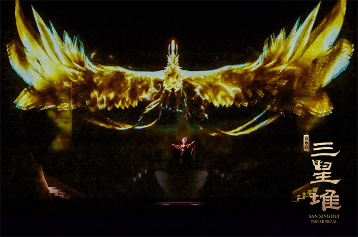 舞美設(shè)計(jì)由倫敦著名設(shè)計(jì)師摩根·拉知(Morgan Large)擔(dān)任,他曾獲2018年英國(guó)戲劇獎(jiǎng)最佳設(shè)計(jì)獎(jiǎng)和4次奧利弗獎(jiǎng)、參與過(guò)《修女也瘋狂》《周日戀曲》等多部著名劇目舞美設(shè)計(jì)。舞美團(tuán)隊(duì)不僅力圖在色彩和道具上還原三千年前青銅王朝的璀璨與輝煌,還通過(guò)兩百余臺(tái)電腦燈呈現(xiàn)不同場(chǎng)景的光影效果。觀眾將非常幸運(yùn)地首次在音樂(lè)劇舞臺(tái)上,一次性看到青銅大立人、青銅大面具、青銅神樹(shù)等極具三星堆代表性文物的復(fù)刻版,加上極具沖擊力和感染力的多媒體技術(shù),生動(dòng)展現(xiàn)了三千年前古蜀國(guó)的璀璨與輝煌。