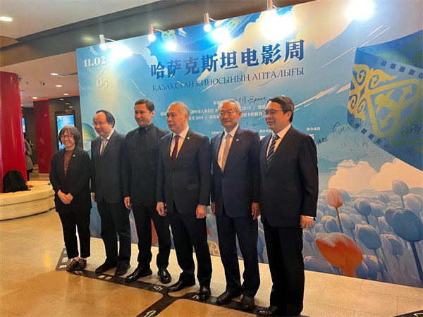 (從右向左:中國傳媒大學校長張樹庭,上海合作組織秘書長張明,哈薩克斯坦共和國駐華大使努雷舍夫,哈薩克斯坦國家電影集團總裁阿扎瑪特·薩特巴勒德,國家電影局常務副局長毛羽,中國電影資料館館長孫向輝)