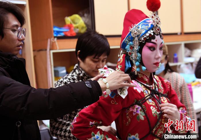 演出開始前,該劇主演劉泳渤在工作人員的協(xié)助下調(diào)整戲裝。 中新網(wǎng)記者劉可耕攝