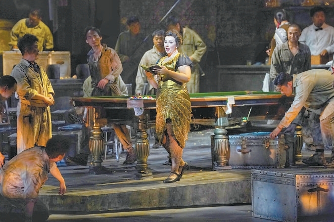 國家大劇院一向注重歌劇的視覺效果,《西部女郎》也不例外。劇目盡可能還原了礦工聚集的酒館、二層的房屋、蒼莽的森林,是劇情氣氛的有力補充,讓觀眾有身臨其境之感。只是,第一幕中酒館的布景在視覺上顯得有點“滿”,舞臺上高高堆疊的箱子雖有立體感,但占據(jù)了大部分視野,再加上第一幕的故事與音樂敘事感很強,復(fù)雜的布景略微有點干擾觀眾對音樂的捕捉。反而第二幕、第三幕二層房屋、森林的設(shè)計極具現(xiàn)代感,充分運用了舞臺空間和假定性的想象,風(fēng)格上也簡潔明了,引人入勝。