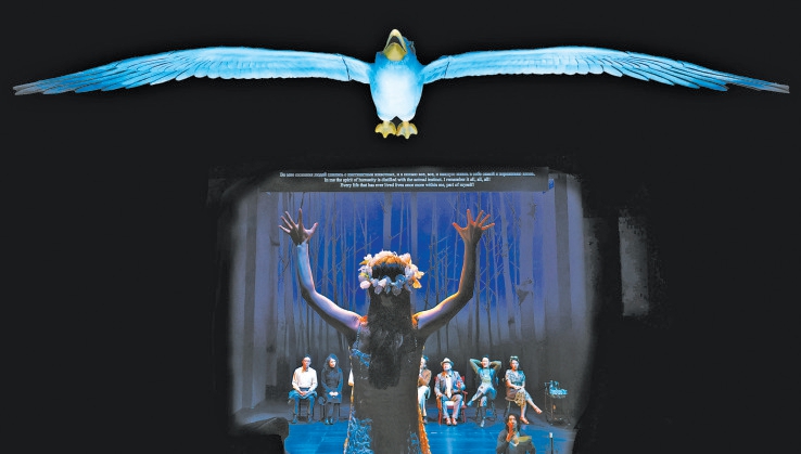 為了實(shí)現(xiàn)這一理念,劇組對舞臺進(jìn)行了大刀闊斧的改造,拆除了部分觀眾席座位,使得舞臺與觀眾席之間形成了一條真實(shí)的“路”。一只巨大的海鷗懸掛在觀眾席上方,成為連接現(xiàn)實(shí)與戲劇世界的紐帶。這種獨(dú)特的舞臺設(shè)計(jì),讓每一位走進(jìn)劇場的觀眾可以看到一個(gè)與傳統(tǒng)鏡框舞臺截然不同的開放式空間,它打破了舞臺與觀眾席之間的界限,不僅營造出一種開放而沉浸的觀演環(huán)境,讓演員的表演更加自然流暢,也讓觀眾能夠更加近距離地感受到劇中人物的情感波動(dòng)和命運(yùn)變遷。