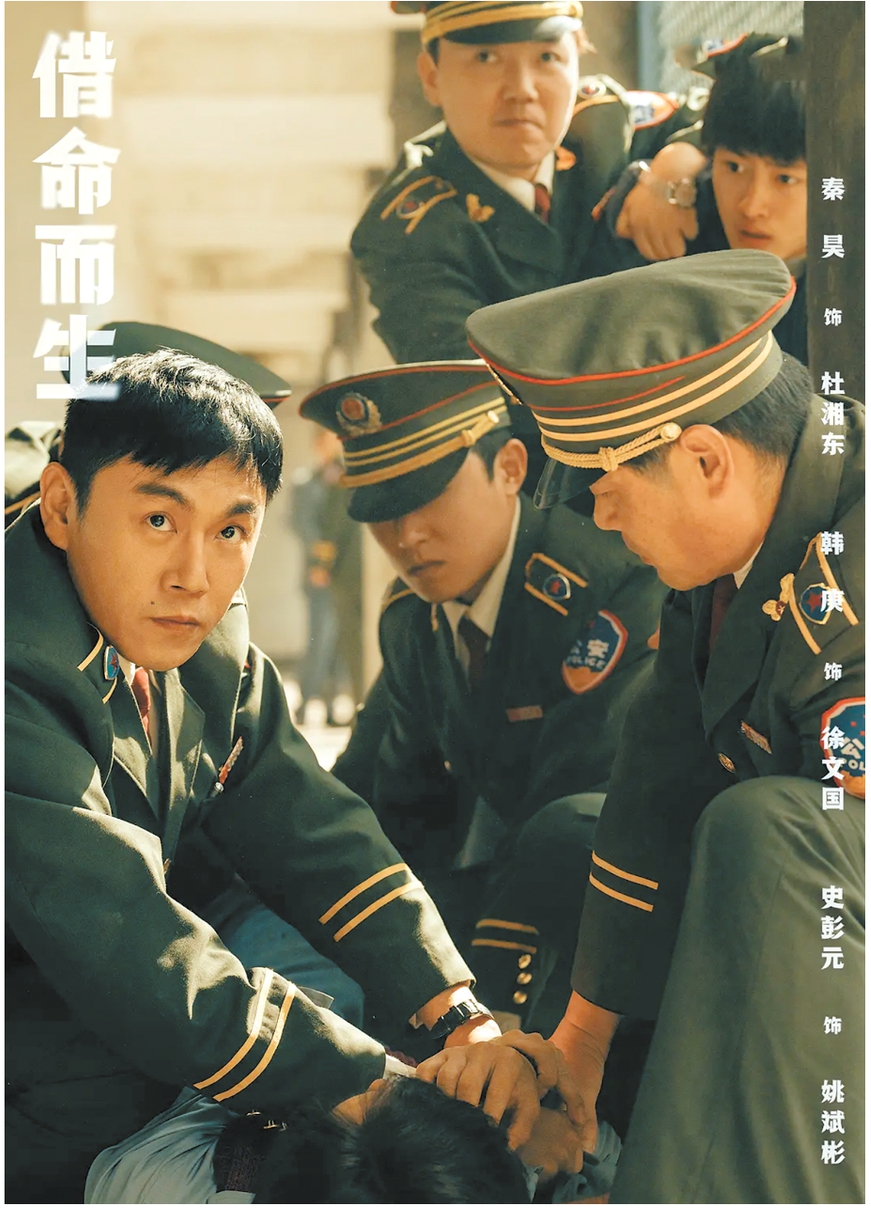 演員的表演處理也指向同樣的藝術(shù)效果。劇中幾場情感表達的重頭戲,都采取了較為克制的呈現(xiàn)。例如姚斌彬槍決前夜與母親訣別的場面,主要表演內(nèi)容是艾麗婭飾演的崔麗珍凄惶、焦急地穿過重重鐵門,姚斌彬做出了含淚抬頭的反應(yīng)。接著崔麗珍短促地喚了一聲“兒子”,姚斌彬崩潰著下跪。演員情感飽滿的表演,在有限的篇幅中形成簡潔有力表達效果。還有多年后杜湘東得知姚斌彬被冤的真相后,極度痛心和憤怒的表演段落。從人物情緒爆發(fā)掀了桌子開始,之前的中景拍攝切換為全景拍攝,秦昊的怒吼、掩面、捶打等發(fā)泄性的動作,因為拍攝視點的遠(yuǎn)離,被納入到街景的整體畫面中,顯得徒勞無力,甚至有些荒誕。這些處理方式,呈現(xiàn)出作品對復(fù)雜性的追求與嘗試,構(gòu)成了《借命而生》獨特的藝術(shù)風(fēng)格。