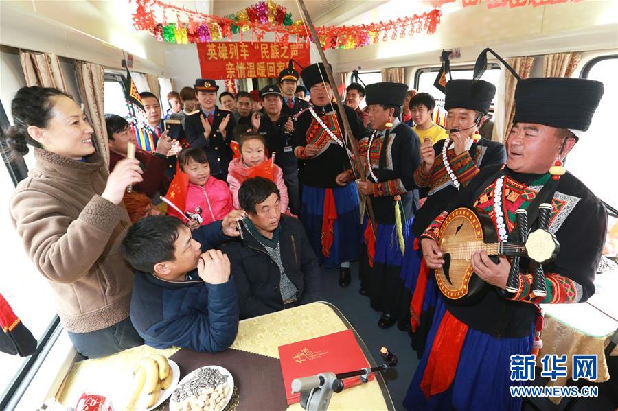 2月1日,彝族藝術(shù)家在K165次列車上為旅客表演。當(dāng)日,在西安鐵路局西安至昆明的K165次列車上,四川美姑縣原生態(tài)畢摩樂(lè)隊(duì)與西安客運(yùn)段職工民樂(lè)小分隊(duì)聯(lián)合舉辦“英雄列車民族之聲親情溫暖回家路”音樂(lè)會(huì),畢摩樂(lè)隊(duì)用口弦、哈門、木葉、瑪布等彝族民間樂(lè)器演奏的音樂(lè)為返鄉(xiāng)過(guò)年的旅客提前送上新年祝福。民間藝術(shù)家和列車乘務(wù)員還為旅客們送上“?!弊帧⒋郝?lián)。新華社發(fā)