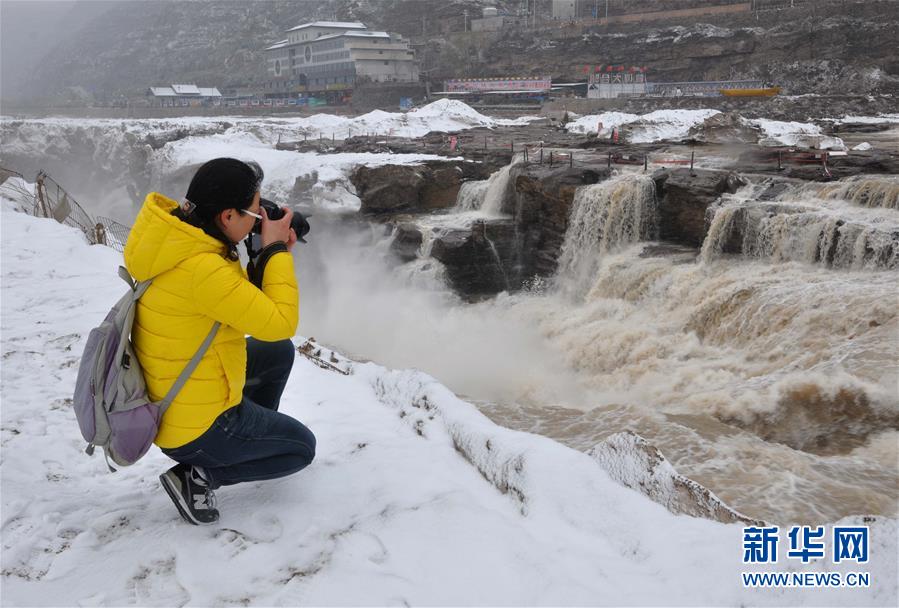 3月9日,一名游客在山西吉縣拍攝飛雪中的黃河壺口瀑布。當(dāng)日,受倒春寒天氣影響,位于山西吉縣和陜西宜川縣交界的黃河壺口瀑布迎來雨雪天氣,奔流的壺口瀑布在白雪的映襯下更顯壯美。新華社發(fā)(呂桂明 攝)